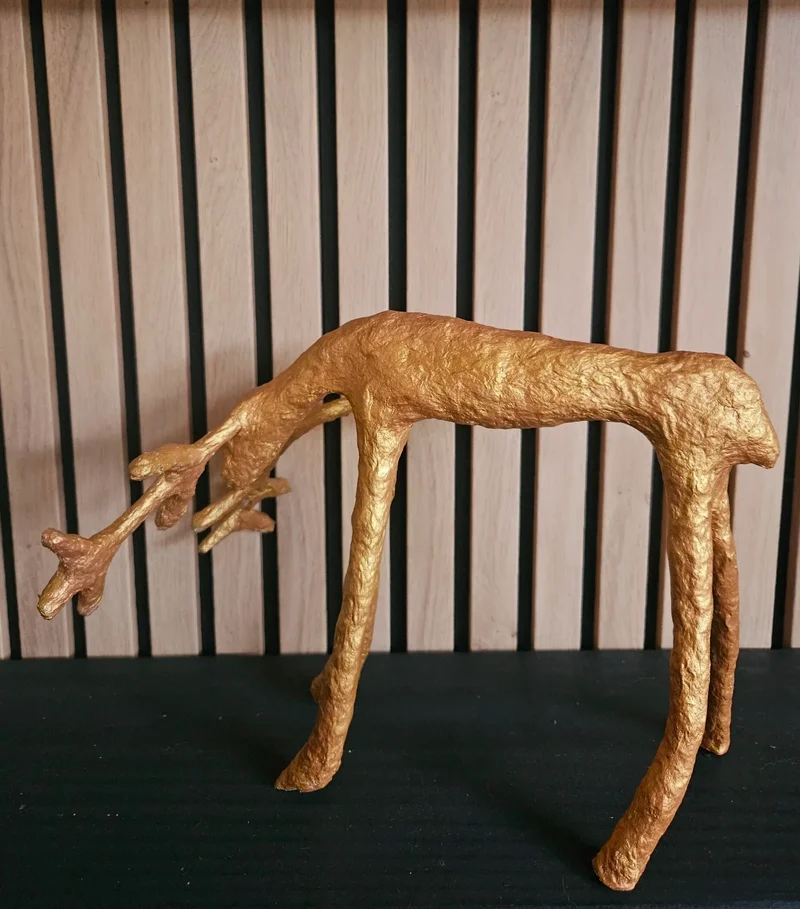 Het gouden hertje is gemaakt van ijzerdraad, tape, aluminiumfolie, papier-maché en gouden acrylverf.